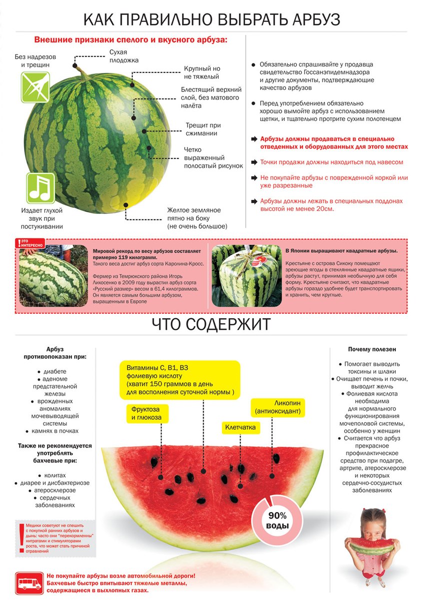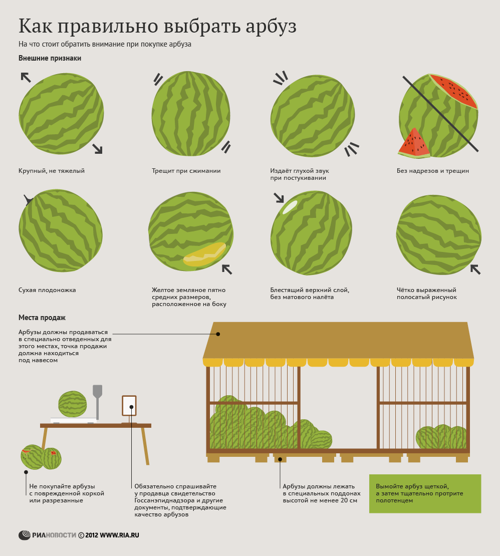 - На нём не должно быть надрезов или трещин. Если есть трещины, то арбуз уже переспел или его раздавило по дороге к магазину. Внутрь могли проникнуть всякие бактерии - вообщем, жуть )